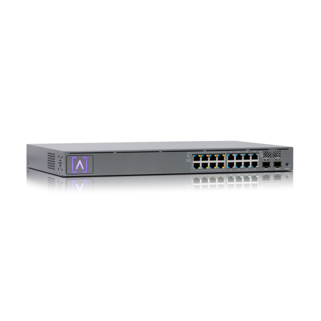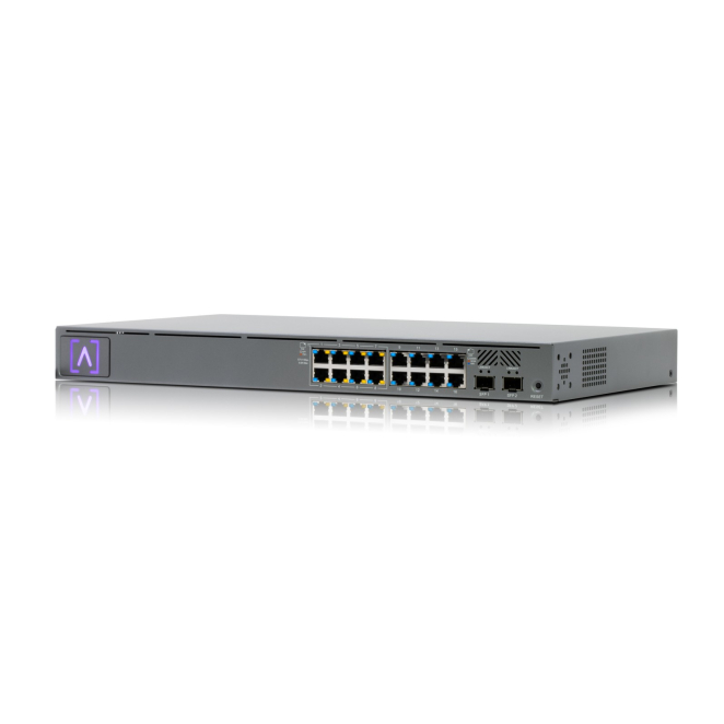 Imagen del switch gestionado Alta Labs S16-POE, que ofrece conectividad Gigabit Ethernet (10/100/1000) y soporte para Energía sobre Ethernet en un chasis de 1U, SKU S16-POE.