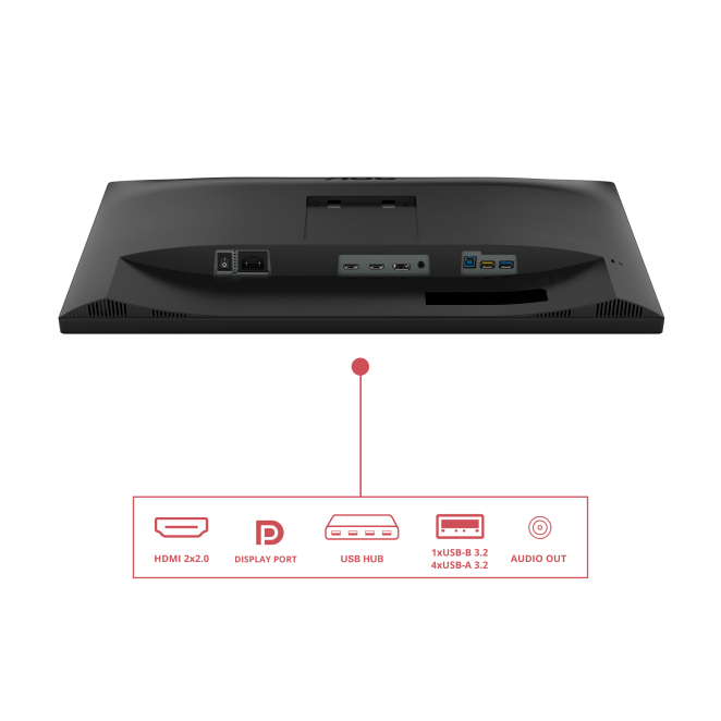 El monitor AOC E3 U27E3UF cuenta con dos puertos HDMI, múltiples puertos USB tipo A, un puerto DisplayPort y una salida para auriculares de 3.5 mm, ofreciendo una conectividad versátil para tus dispositivos.