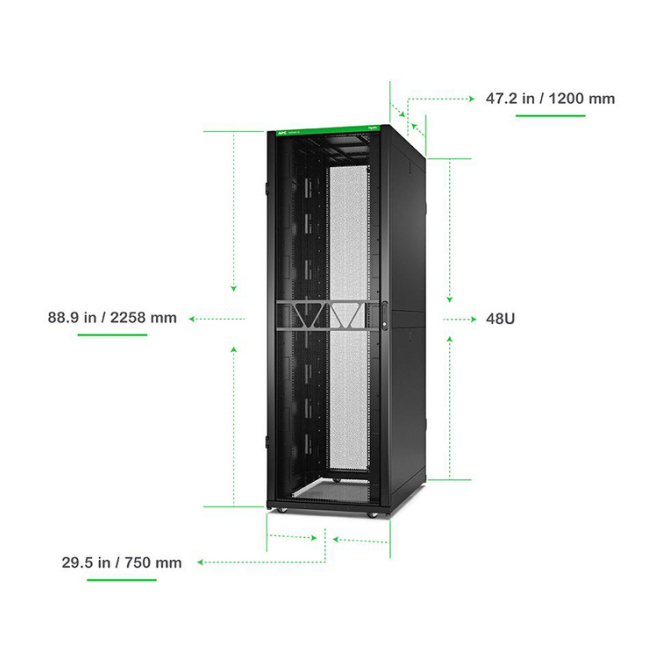 Aquí tienes una lista de preguntas frecuentes para el APC AR3357B2 armario rack 48U: El APC AR3357B2 puede soportar hasta 1814 kg de equipos, haciéndolo ideal para alojar dispositivos pesados. Sí, el APC AR3357B2 cuenta con paneles laterales desmontables que facilitan el acceso a los equipos interiores. La puerta del APC AR3357B2 se abre hasta 270 grados, proporcionando un amplio acceso para mantenimiento y ajustes. Sí, el APC AR3357B2 incluye patas ajustables para asegurar que se mantenga nivelado en cualquier superficie. El APC AR3357B2 cuenta con una garantía de 5 años, brindando tranquilidad y seguridad en su inversión. Capacidad del rack 48U Tipo Rack o bastidor independiente Capacidad máxima de peso 1814 kg Color del producto Negro Paneles laterales incluidos Sí Patas ajustables Sí Tamaño (imperial) 19 " Ancho 750 mm Profundidad 1200 mm Altura 2258 mm Peso 177780 g Profundidad de montaje (máx.) 1048 mm Profundidad de montaje (mín.) 286 mm Ancho del paquete 853 mm Profundidad del paquete 1323 mm Altura del paquete 2395 mm Peso del paquete 201820 g Certificados de conformidad REACH, RoHS
