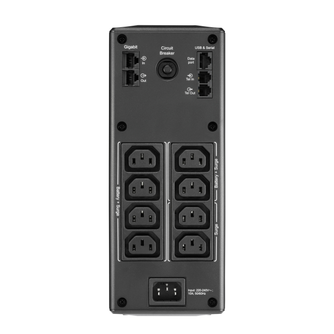 Este sistema de alimentación ininterrumpida cuenta con 8 salidas AC, proporcionando suficiente capacidad para respaldar múltiples dispositivos.