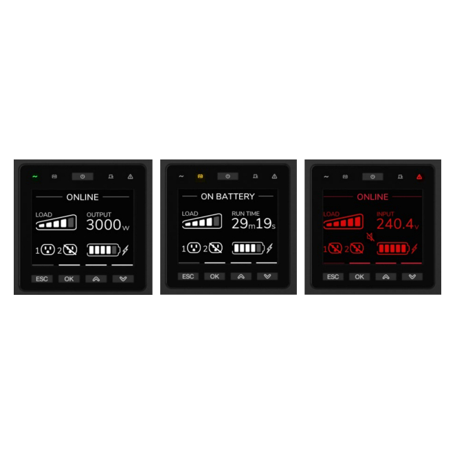 Pantalla LCD y alarmas audibles proporcionan una fácil monitoreo y gestión del estado del UPS.