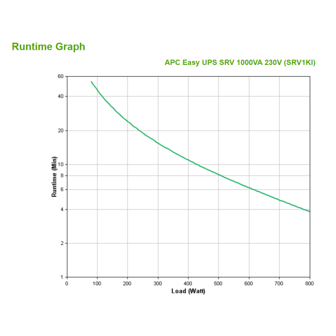 El APC SRV1KI UPS ofrece un tiempo típico de respaldo de 4 minutos a carga completa y hasta 10 minutos a media carga, permitiendo una autonomía prolongada durante cortes de energía.