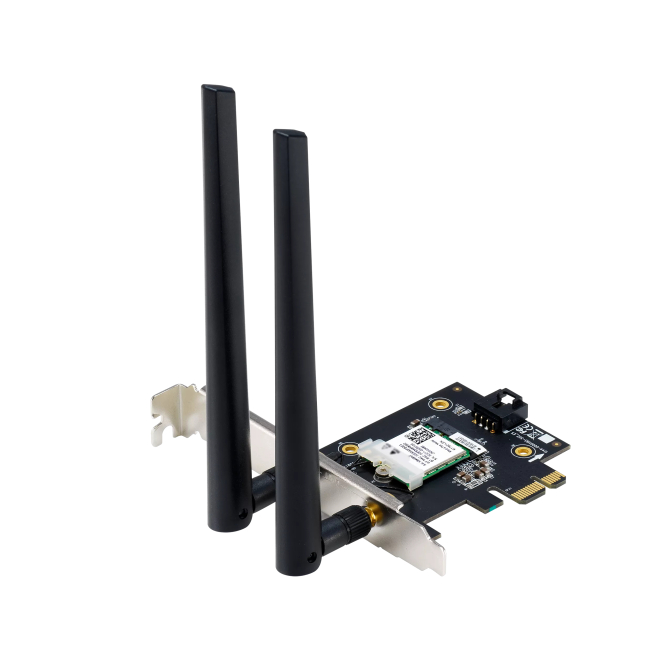El ASUS PCE-AXE5400 se instala en una ranura PCI-Express x1. Asegúrate de que tu computadora tenga una ranura compatible. El ASUS PCE-AXE5400 soporta el estándar WiFi 6E (802.11ax), lo que permite una conectividad más rápida y fiable. El ASUS PCE-AXE5400 cuenta con dos antenas externas que mejoran significativamente la señal y cobertura. Sí, el ASUS PCE-AXE5400 incluye Bluetooth 5.2, proporcionando velocidades de transmisión más rápidas y un mayor alcance. El adaptador utiliza el protocolo de seguridad WPA3, ofreciendo una capa adicional de protección contra ataques externos. Componente para PC Interno Sí Sistema operativo Windows soportado Windows 10 x64, Windows 11 x64 Tecnología de conectividad Alámbrico Interfaz de host PCI Express Interfaz WLAN Rango máximo de transferencia de datos 2402 Mbit/s Estándares de red IEEE 802.11a, IEEE 802.11ac, IEEE 802.11ax, IEEE 802.11b, IEEE 802.11g, IEEE 802.11n Wifi Sí Peso 49.7 g