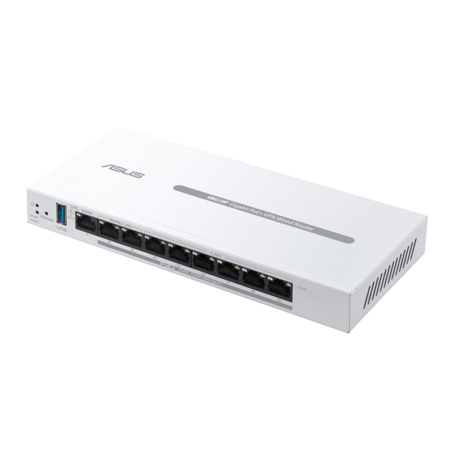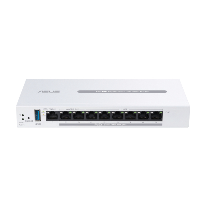 El ASUS ExpertWiFi EBG19P cuenta con ocho puertos Ethernet LAN y dos puertos WAN para una conectividad máxima.
