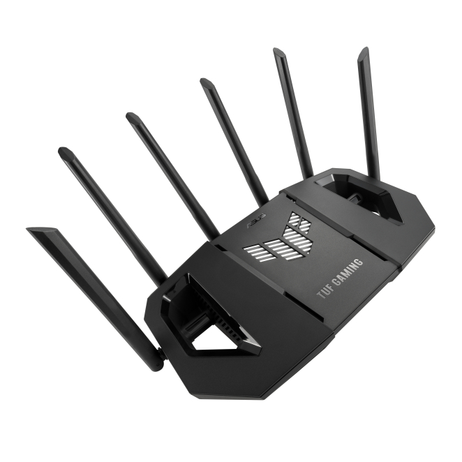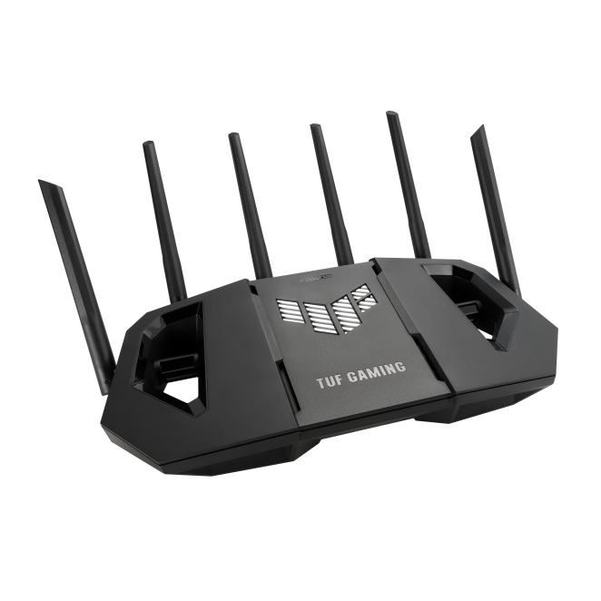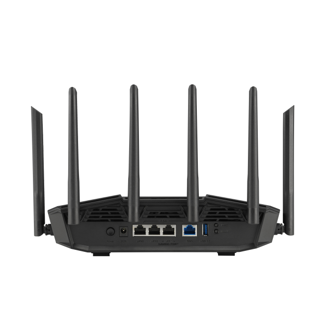 Imagen del router inalámbrico ASUS modelo 90IG0A30-MO9C00, de color negro, con capacidades tribanda (2.4 GHz, 5 GHz, 6 GHz) y velocidad de 2.5 Gigabit Ethernet