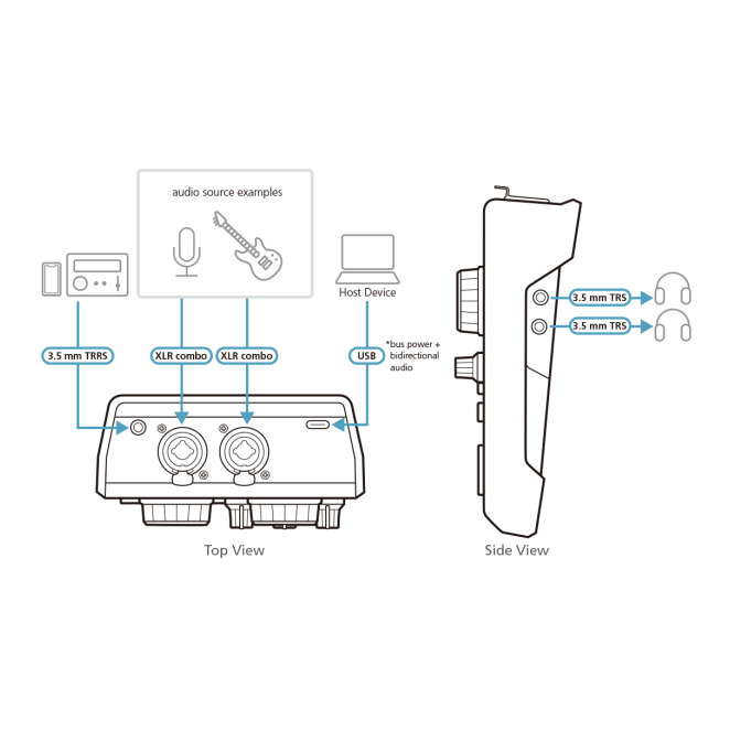 Incluye dos entradas de conector combinado XLR/6,3 mm, salidas de auriculares y un puerto USB para máxima flexibilidad.