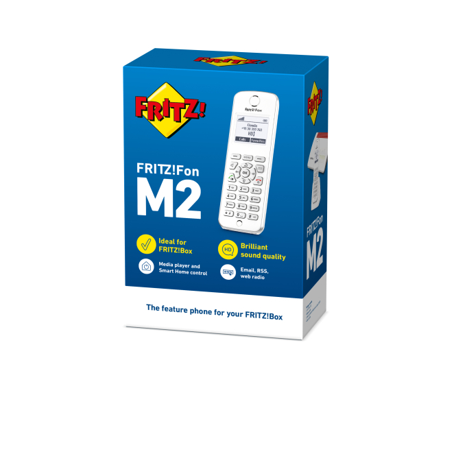 El Fon FRITZ! M2 International incluye funciones adicionales como contestador automático, radio por Internet, recepción y envío de correos electrónicos y vigilancia de bebés.