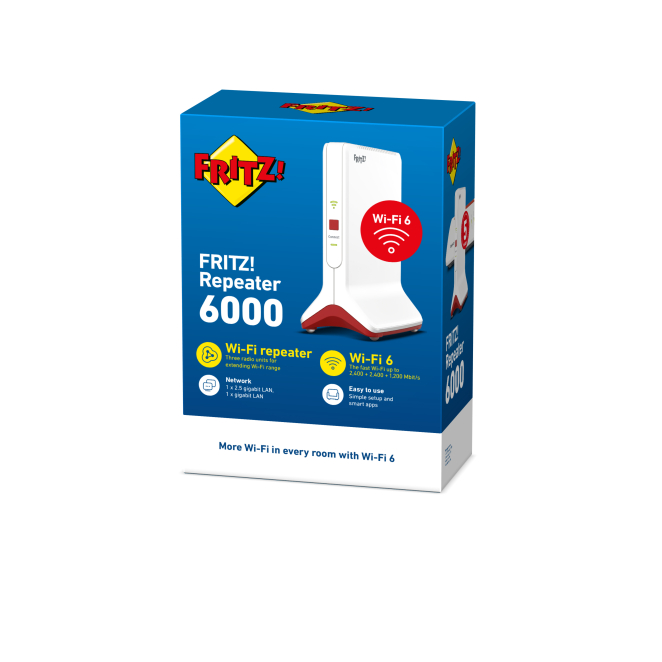 El FRITZ!Repeater 6000 garantiza el más alto rendimiento Wi-Fi en la red local con el último Wi-Fi 6. Con tres unidades de radio, puede alcanzar una velocidad de hasta 6,000 Mbps. Este potente repetidor Wi-Fi proporciona una conexión estable y un ancho de banda máximo para todos los dispositivos Wi-Fi conectados. Al mismo tiempo, el FRITZ!Repeater 6000 garantiza una cobertura Wi-Fi perfecta en todos los rincones de la casa con el Intelligente Wi-Fi Mesh. Los dispositivos FRITZ! conectados trabajan en una única red, intercambian datos entre sí y mejoran el rendimiento de todos los dispositivos inalámbricos. Perfecto para streaming, gaming y descargas. Gracias a las actualizaciones gratuitas, el FRITZ!Repeater 6000 siempre está a la última en seguridad y con las más completas funciones. Indicadores LED para su óptima posición, asistentes de software y una interfaz de usuario intuitiva completan sus características.