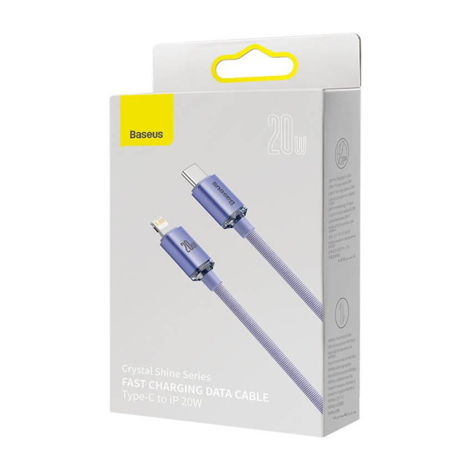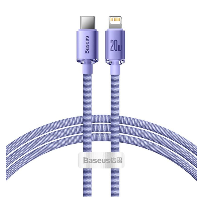 Cable de teléfono móvil Baseus Crystal Shine en color púrpura, 1,2 metros de longitud, con conectores USB C a Lightning, SKU CAJY000205