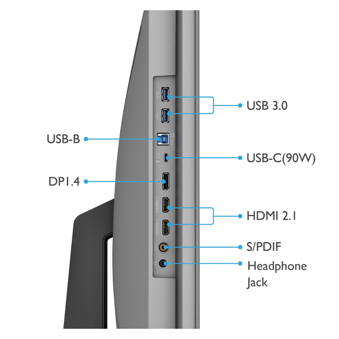 El monitor BenQ EX480UZ cuenta con puertos USB tipo C, HDMI 2.1 y DisplayPort 1.4, proporcionando una amplia variedad de opciones de conectividad.