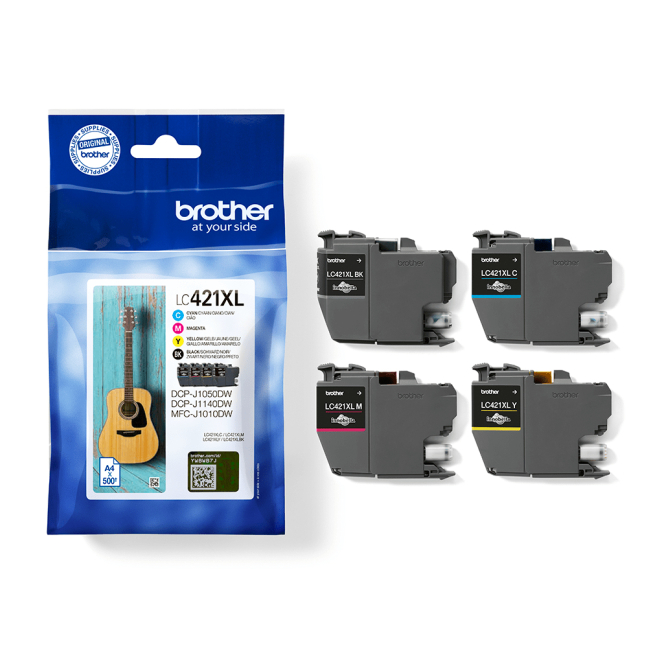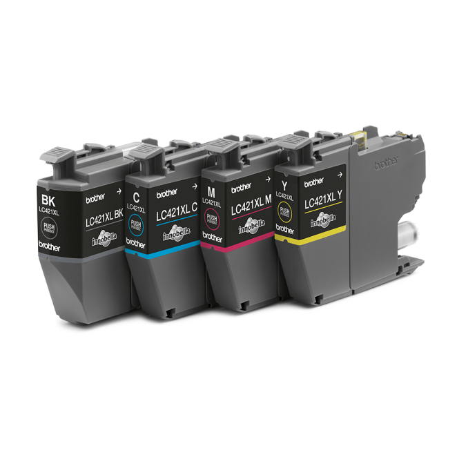 El multipack Brother LC421XLVAL incluye los colores negro, cian, magenta y amarillo, cubriendo todas tus necesidades de impresión en color y en negro.