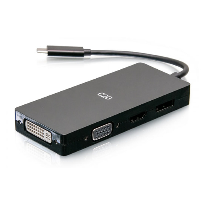El adaptador multipuerto USB-C de C2G modelo C2G54454 con salidas de vídeo HDMI, DisplayPort, DVI y VGA, compatible con resolución 4K a 60 Hz.