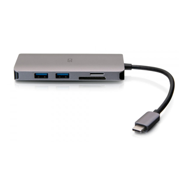 Imagen de la mini base C2G USB-C 8 en 1 con HDMI, 2 puertos USB-A, Ethernet, lector de tarjeta SD y USB-C hasta 100W, SKU C2G54458