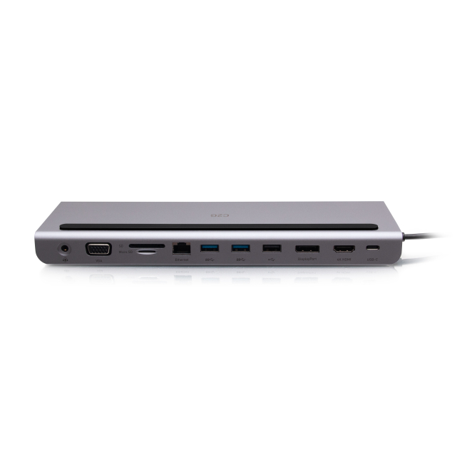 Base de triple pantalla 10 en 1 C2G con USB-C, HDMI, DisplayPort, VGA, Ethernet, USB, lector de tarjeta SD, audio de 3,5 mm y suministro de energía de hasta 100 W. SKU: C2G54542