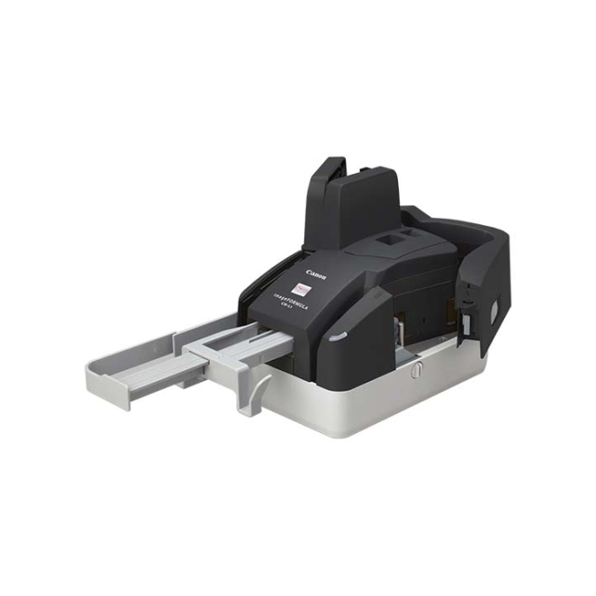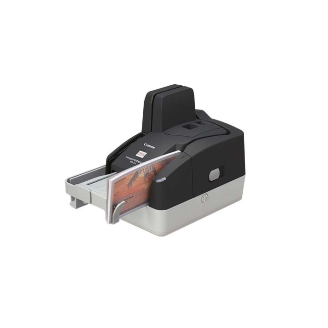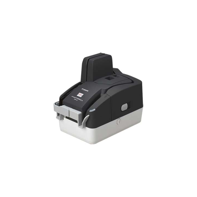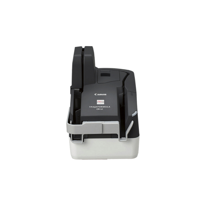 Escáner de cheques Canon imageFORMULA CR-L1 con una resolución de 300 x 300 DPI, en color negro y gris. SKU 3595C003.