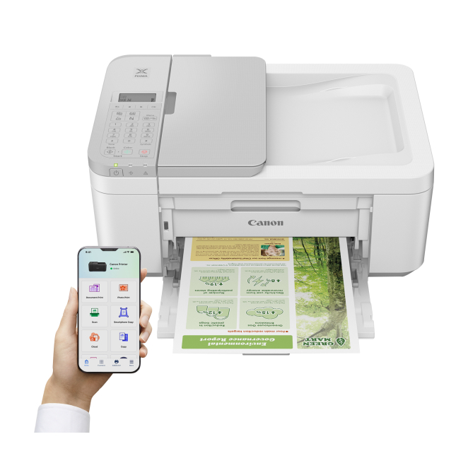 La Canon PIXMA TR4756i es una impresora multifuncional diseñada para pequeños negocios y oficinas que requieren la máxima eficiencia. Este dispositivo combina funciones de impresión, copia, escaneo y fax en un compacto diseño blanco. Con una resolución de hasta 4800 x 1200 DPI, la Canon PIXMA TR4756i ofrece impresiones de alta calidad y colores vibrantes. Además, cuenta con conectividad Wifi y funciones de impresión directa, lo que facilita su uso desde dispositivos móviles. Su capacidad de impresión dúplex y el alimentador automático de documentos (ADF) son características que optimizan el flujo de trabajo.