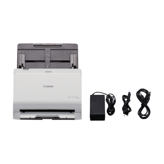 El paquete del Canon imageFORMULA R30 incluye el escáner, un cable de alimentación y un cable USB para facilitar la conexión y puesta en marcha inmediata.