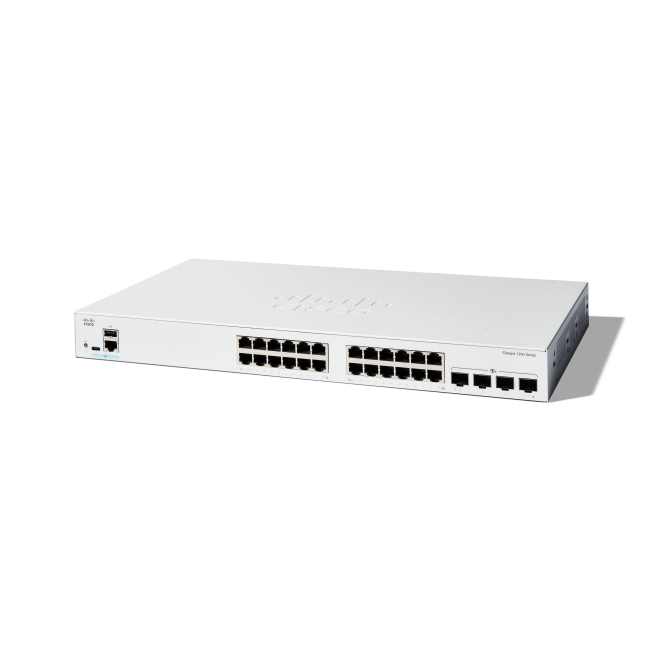 Imagen del Switch gestionado Cisco modelo C1200-24T-4X, compatible con L2/L3 y Gigabit Ethernet (10/100/1000) en color blanco. SKU C1200-24T-4X