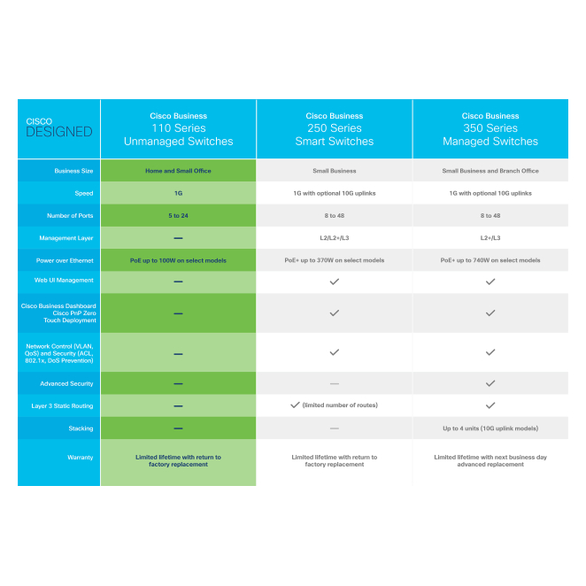 El Switch L2 Cisco CBS110 es una inversión inteligente para cualquier negocio que necesite una red confiable y eficiente. A continuación, se presentan algunas razones clave para considerar su compra: Es plug-and-play, ideal para usuarios sin conocimientos técnicos. Ofrece un rendimiento constante y óptimo para aplicaciones críticas. Cuenta con una capacidad de conmutación de 10 Gbit/s y soporte para tramas jumbo. Incluye modo de ahorro de energía (EEE), lo que lo hace eficiente en términos de consumo eléctrico. Ofrece todas estas características sin la necesidad de inversión en switches administrados más costosos.