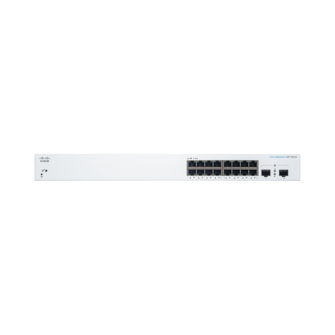 Imagen del switch Cisco CBS220-16T-2G gestionado L2 con 16 puertos Gigabit Ethernet y 2 puertos Gigabit adicionales en color blanco, SKU CBS220-16T-2G-UK