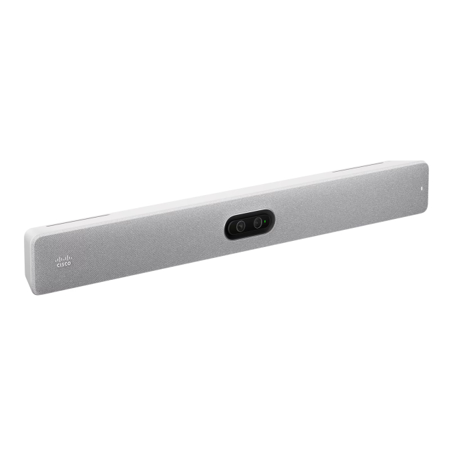 Cisco Room Bar Pro, un sistema de videoconferencia con cámara de 48 MP, conexión Ethernet alta velocidad. SKU CS-BARPRO-K9
