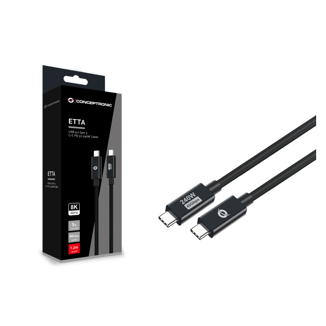 El Conceptronic ETTA04B12 cable USB es la solución ideal para aquellos que buscan una conexión rápida y de alta calidad. Este cable USB negro cuenta con una longitud de 1,2 metros y conectores USB C en ambos extremos. Fabricado con una cubierta trenzada resistente, ofrece una durabilidad superior y una transferencia de datos rápida de hasta 40 Gbit/s. Adicionalmente, soporta una entrega de energía USB (USB Power Delivery) de hasta 240W, lo que lo convierte en un accesorio indispensable para cargar y alimentar dispositivos modernos.