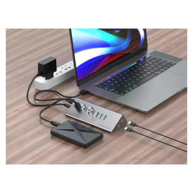 Simplemente conecta el hub a tu interfaz USB 3.2 Gen 1 (Type-B) y estará listo para usar, facilitando su integración en cualquier ambiente.