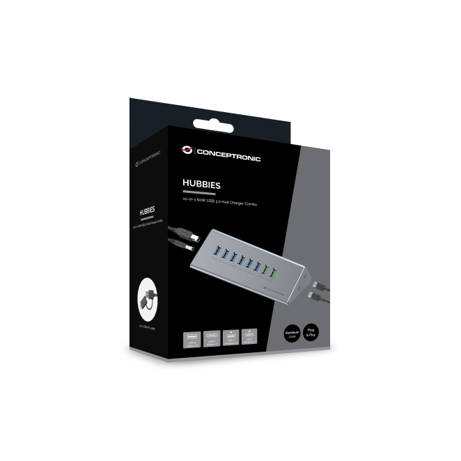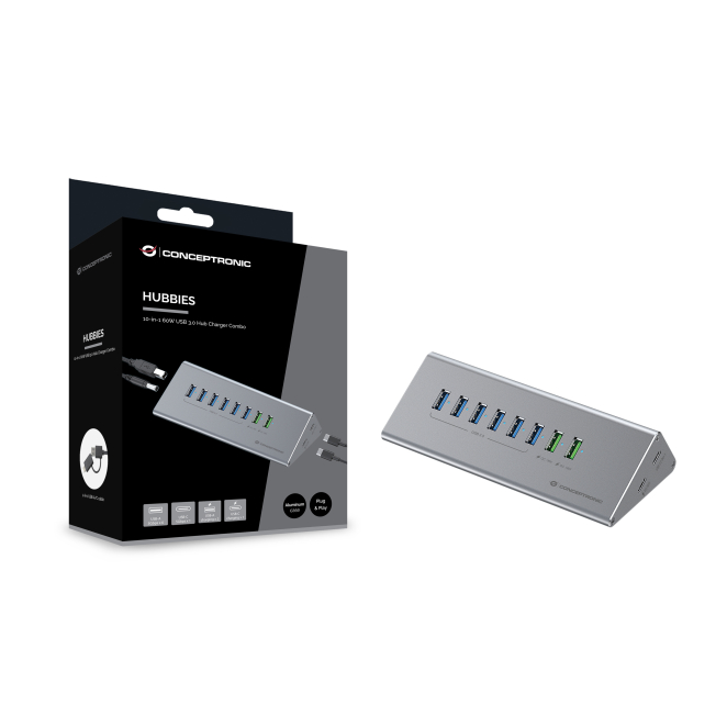 El Conceptronic HUBBIES18G es un hub de interfaz USB 3.2 Gen 1 (3.1 Gen 1) Type-B diseñado para proporcionar una expansión de puertos USB eficiente y rápida. Con 10 puertos, incluyendo 8 puertos Type-A y 2 puertos Type-C, este hub es ideal para quienes necesitan una conectividad versátil con velocidades de transferencia de hasta 5000 Mbit/s. Su diseño compacto y elegante en color gris, junto a su carcasa de aluminio duradera, lo convierte en un accesorio imprescindible para cualquier configuración tecnológica. Además, su fuente de alimentación de 60W garantiza un rendimiento estable y confiable.