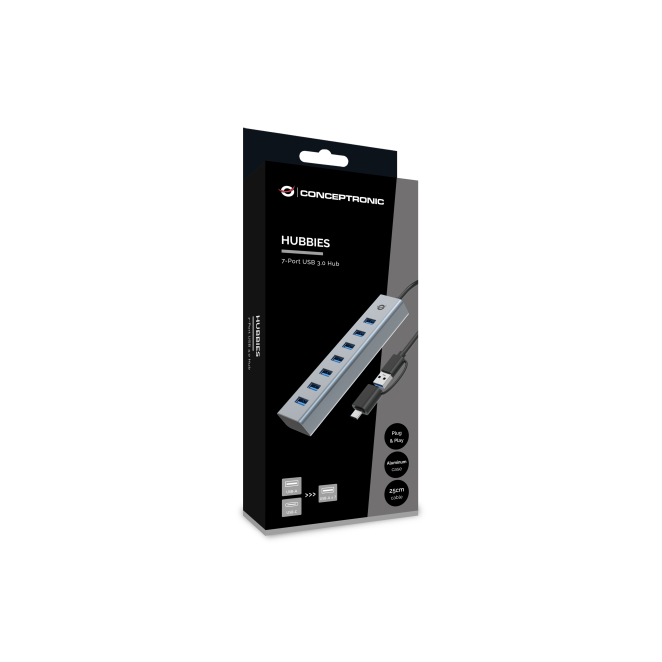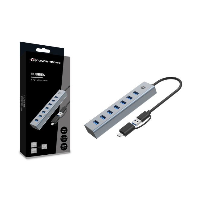 El Conceptronic HUBBIES21G hub es la solución ideal para maximizar la conectividad de tus dispositivos con una interfaz USB 3.2 Gen 1 (3.1 Gen 1) Type-A, ofreciendo una velocidad de transferencia de datos de hasta 5000 Mbit/s. Este práctico hub de alta velocidad en color gris, fabricado con una resistente carcasa de aluminio, cuenta con siete puertos USB 3.2 Gen 1 para que puedas conectar todos tus dispositivos de manera simultánea. Su diseño portátil y su función de Plug and Play lo hacen perfecto para usar con múltiples sistemas operativos como Windows y Mac.
