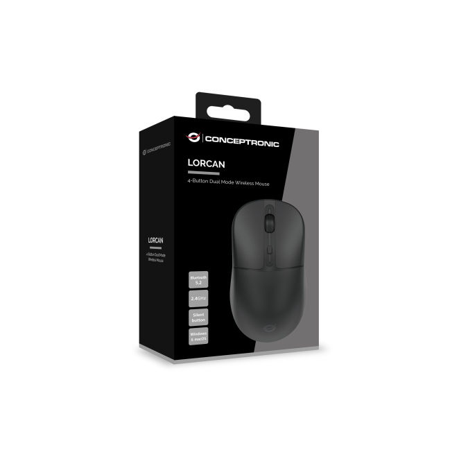 Ratón Conceptronic LORCAN04B diseñado para oficina, ambidextro, inalámbrico RF y Bluetooth, con sensor óptico de 1600 DPI.