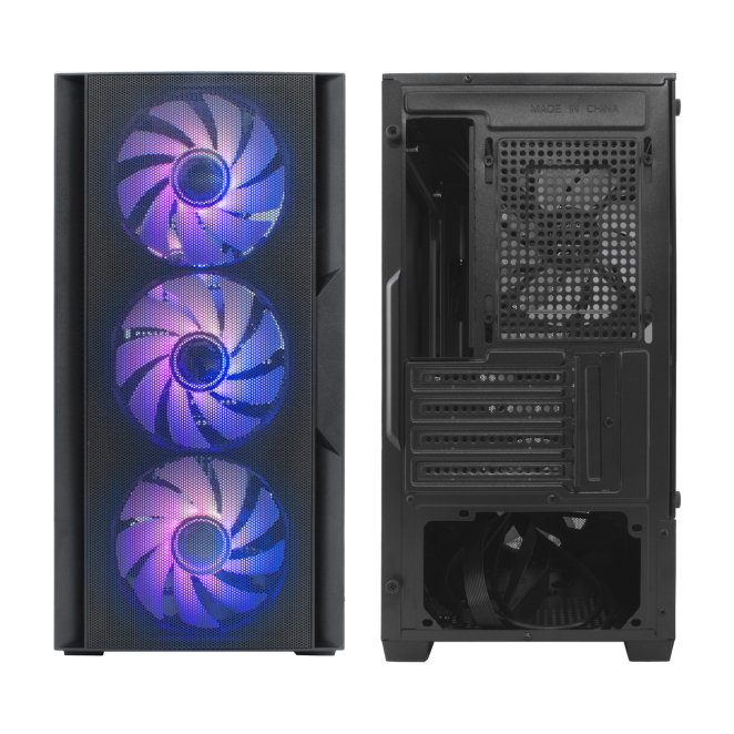 CoolBox GAMING CAJA MATX GM220 FUSION negra con panel de malla, conectividad USB-C 3.2 Gen1, sin fuente de alimentación incluida, y 4 ventiladores ARGB – SKU: COO-CHA-GM220B-0