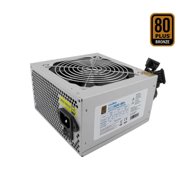 La fuente de alimentación CoolBox ECO-500 tiene una eficiencia del 85%, lo cual está certificado por la norma 80+ Bronze.