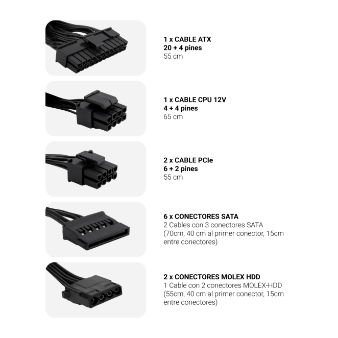Incluye conectores de energía SATA, Molex, PCI Express (6+2 pines), y un conector de alimentación para la CPU (4+4 pines).