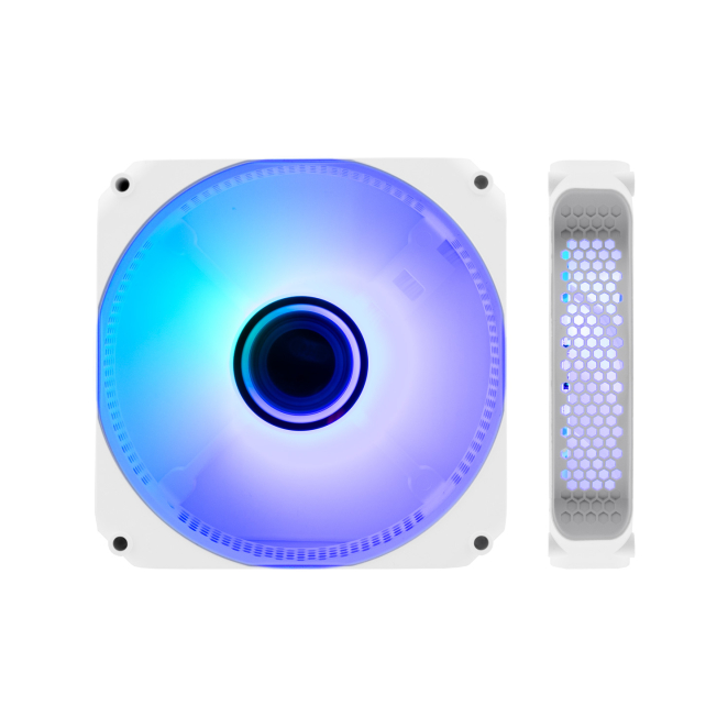 Fotografía del ventilador gaming CoolBox Infinity ARGB de 120mm en color blanco, modelo COO-VA-12AR02W, ideal para mejorar el enfriamiento de tu PC con un estilo moderno.
