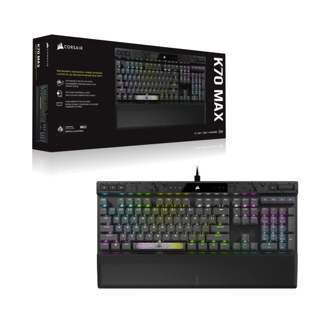 Teclado para juegos Corsair K70 MAX, conexión USB, layout en inglés de EE. UU., color negro, con iluminación RGB, SKU CH-910961G-NA