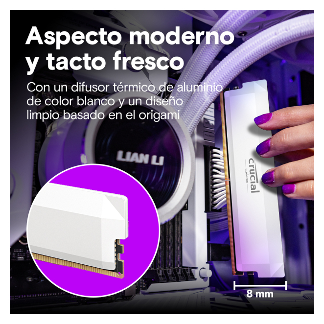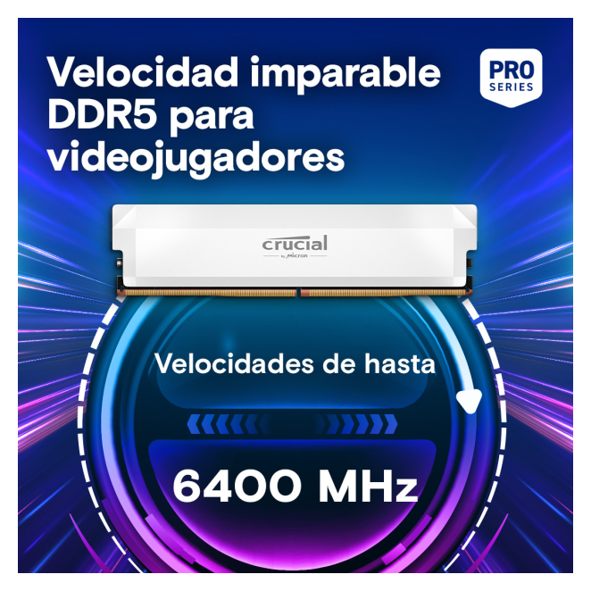 Este producto se puede comprar bajo demanda. Financiado desde: 28,63 € /mes Solicita información en caso de necesitar envío urgente. Métodos de pago: Crucial Pro CP2K32G64C40U5W módulo de memoria 64 GB 2 x 32 GB DDR5 para PC El Crucial Pro CP2K32G64C40U5W módulo de memoria 64 GB 2 x 32 GB DDR5 para PC es la elección perfecta para quienes buscan un rendimiento superior. Con una velocidad de reloj de 6400 MHz, esta memoria RAM DDR5 es ideal para juegos AAA que requieren alta capacidad y velocidad. El Crucial Pro muestra compatibilidad con las más recientes CPU multinúcleo, y su diseño de memoria de 288 pines con disipador térmico asegura eficiencia y estabilidad. Además, soporta perfiles de overclocking Intel® XMP 3.0 y AMD EXPO™, proporcionando flexibilidad y rendimiento excepcionales. El Crucial Pro CP2K32G64C40U5W módulo de memoria 64 GB 2 x 32 GB DDR5 ofrece una serie de beneficios que lo hacen destacar en el mercado. Con su impresionante velocidad de 6400 MHz, asegura que tu PC funcione de manera rápida y eficiente, permitiendo una experiencia de juego y multitarea sin interrupciones. Este módulo de memoria no solo mejora la velocidad de fotogramas en juegos intensivos, sino que también es compatible con las últimas CPU multinúcleo, facilitando la creación de sistemas potentes y equilibrados. La compatibilidad con perfiles de overclocking de Intel y AMD proporciona flexibilidad para personalizar el rendimiento según tus necesidades.