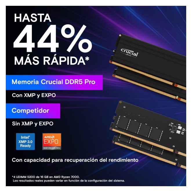 El Crucial Pro CP2K64G56C46U5 ofrece múltiples beneficios que lo hacen destacar en el mercado. Su velocidad de reloj de 5600 MHz permite un rendimiento superior, mientras que la latencia CAS de 46 asegura tiempos de respuesta rápidos. Con un diseño de memoria de 2 x 64 GB, esta RAM Crucial DDR5 facilita la instalación en cualquier equipo, incluso en los más compactos. Además, su compatibilidad con Intel® XMP 3.0 y AMD EXPO™ promoverá una fácil recuperación del rendimiento.