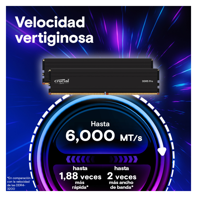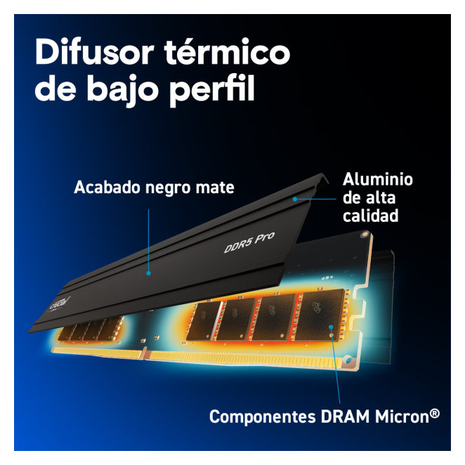Este producto se puede comprar bajo demanda. Financiado desde: 42,67 € /mes Solicita información en caso de necesitar envío urgente. Métodos de pago: Módulo de Memoria Crucial Pro CP2K64G56C46U5 128 GB DDR5 Descubra el Crucial Pro CP2K64G56C46U5, un módulo de memoria DDR5 de 128 GB con una configuración de 2 x 64 GB, diseñado específicamente para PC. Esta memoria destaca no solo por su capacidad y velocidad de reloj a 5600 MHz, sino también por su avanzado sistema de disipación térmica que mantiene un rendimiento óptimo bajo cualquier circunstancia. Compatible con perfiles Intel® XMP 3.0 y AMD EXPO™, el módulo de memoria Crucial Pro es ideal tanto para gamers como para profesionales exigentes.