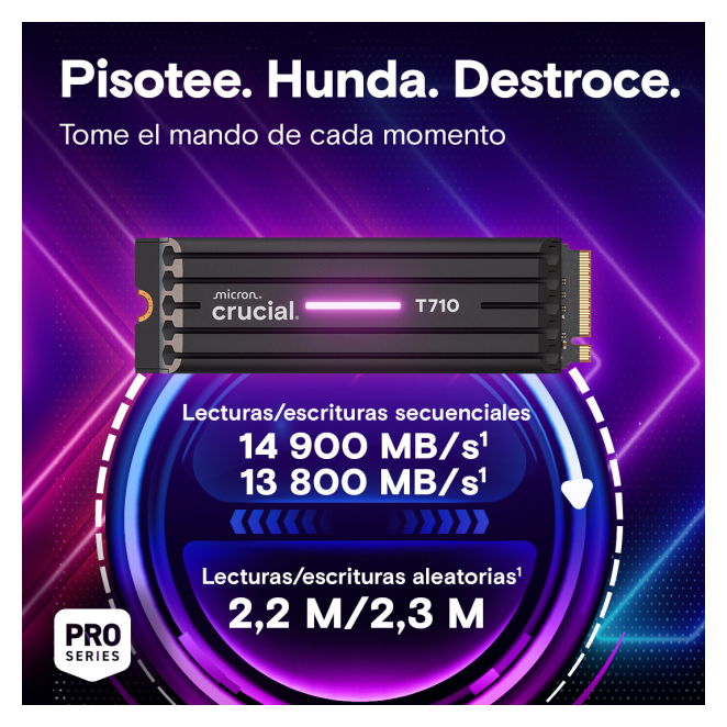 Velocidad imbatible: Con velocidades de lectura de hasta 14900 MB/s y escritura de hasta 13700 MB/s, el SSD Crucial T710 garantiza un rendimiento extremo.