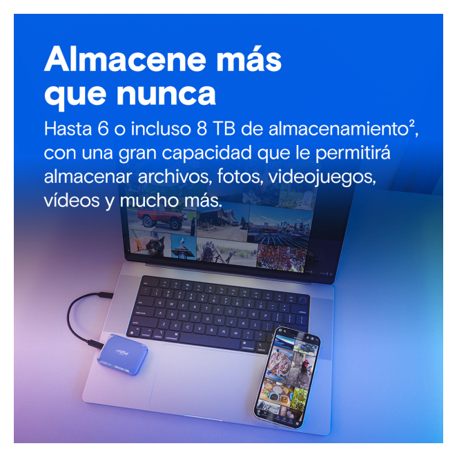 El Crucial X10 1 TB USB Tipo C USB 3.2 Gen 2×2 Azul ofrece varios beneficios notables. Gracias a su velocidad de lectura de hasta 2100 MB/s, disfrutarás de una transferencia de datos rápida y eficiente, ideal para gestionar grandes volúmenes de información en poco tiempo. Su capacidad de 1 TB te proporciona el espacio necesario para almacenar cientos de miles de fotos, videos y documentos. Además, su construcción robusta asegura la resistencia a impactos y elementos externos, siendo una opción duradera y fiable para almacenamiento externo.
