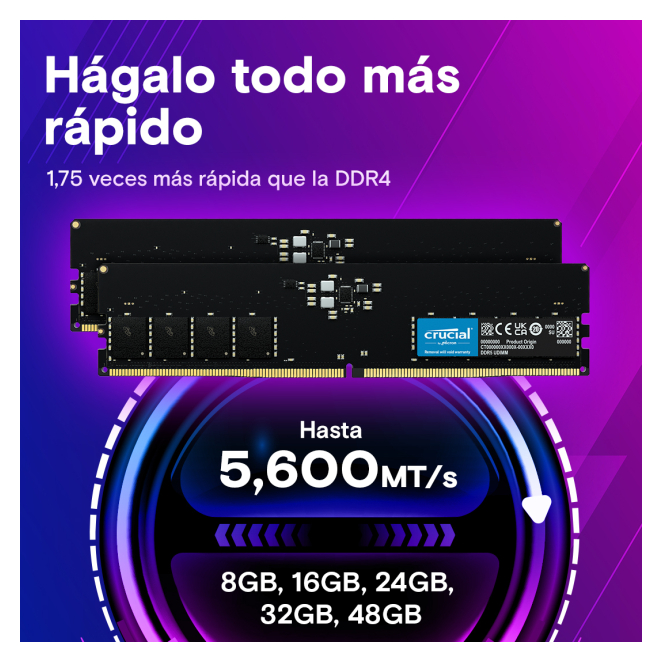 Máximo Rendimiento: El Crucial CT2K64G56C46U5 ofrece velocidades un 50 % más altas que las DDR4, proporcionando transferencia de archivos, descargas y tiempos de carga ultrarrápidos.