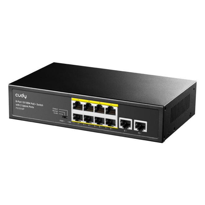 El Cudy FS1010P switch Fast Ethernet cuenta con 8 puertos PoE, de los cuales 2 son PoE+.