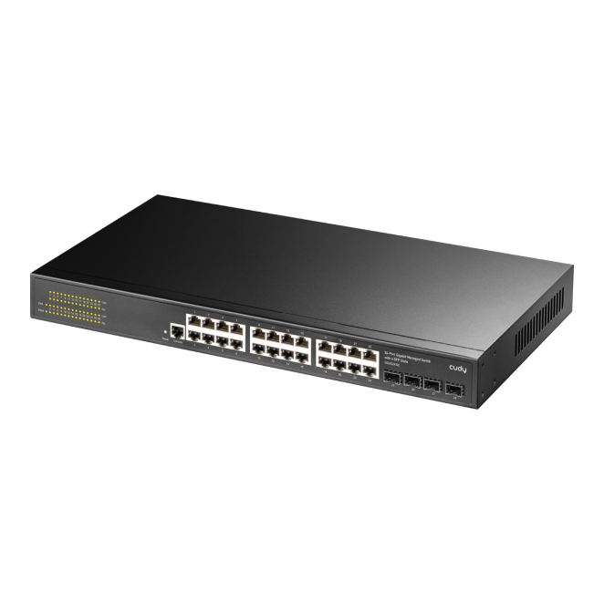 El Cudy GS2024S2 cuenta con 24 puertos Gigabit Ethernet (10/100/1000) y 4 módulos SFP, proporcionando una conectividad versátil y rápida.