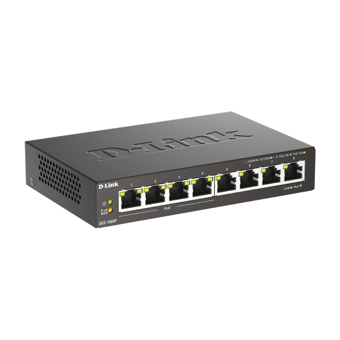 D-Link DGS-1008P/E, switch no administrado L2 Gigabit Ethernet (10/100/1000) con PoE, color negro, SKU DGS-1008P/E