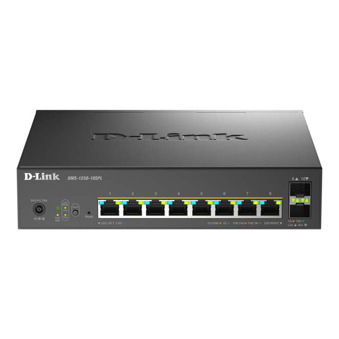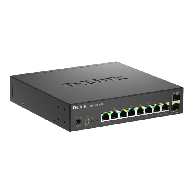 D-Link switch gestionado DMS-1250-10SPL con 10 puertos 2.5G Ethernet, soporte PoE, en color negro, SKU DMS-1250-10SPL/E