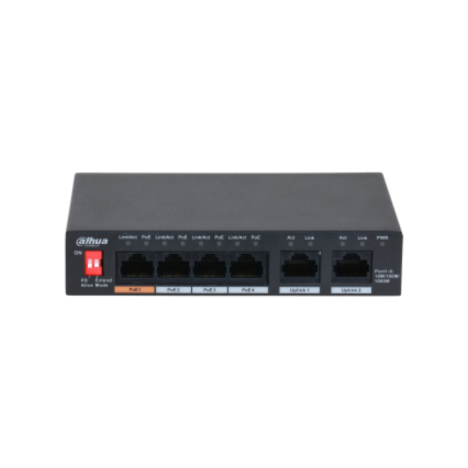 El switch Dahua Technology PFS3006-4GT-60-V2 ofrece seis puertos Gigabit Ethernet (10/100/1000) y cuatro de ellos son compatibles con Energía sobre Ethernet (PoE).