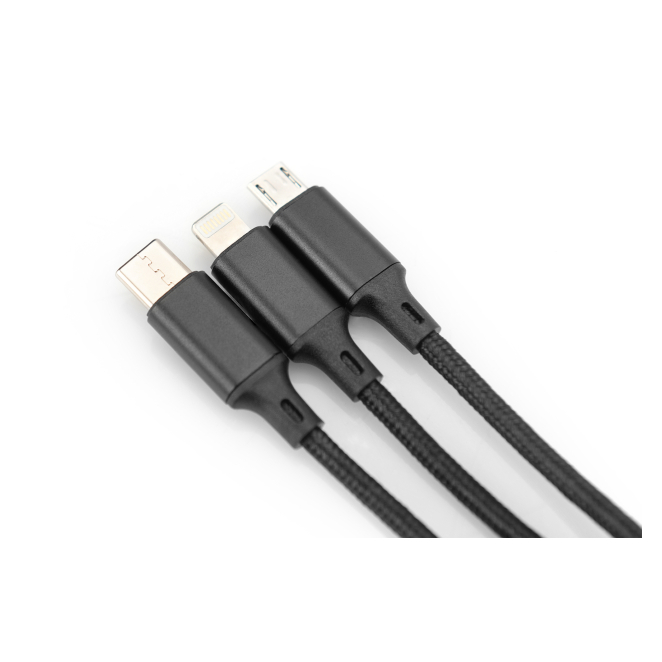 Digitus Cable de carga 3 en 1 con conectores USB-C, Micro USB y Lightning, especificado por SKU AK-300160-010-S. Ideal para múltiples dispositivos.