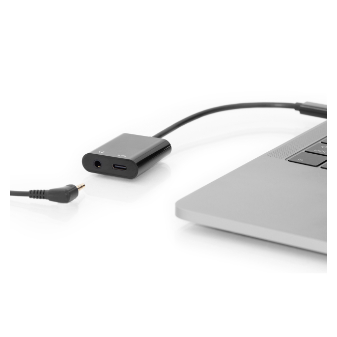 Adaptador Digitus USB Type-C a USB-C y toma de 3.5 mm AK-300400-002-S. Permite conectividad de auriculares y carga simultánea.