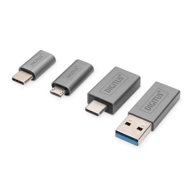 Imagen del juego de adaptadores USB Digitus, incluidas 4 piezas diseñadas para ofrecer una conectividad versátil, SKU: DB-300510-000-G.