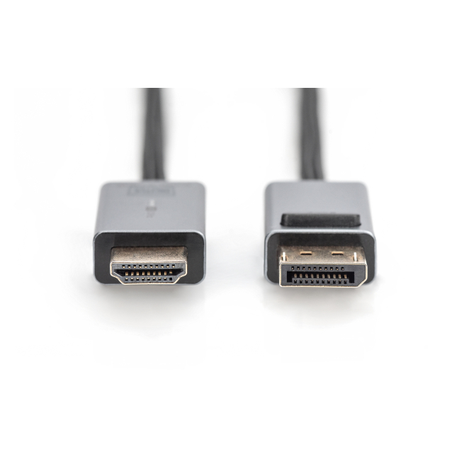 Imagen del cable adaptador Digitus 4K DisplayPort a HDMI tipo A, SKU DB-340202-010-S, ideal para video en alta definición